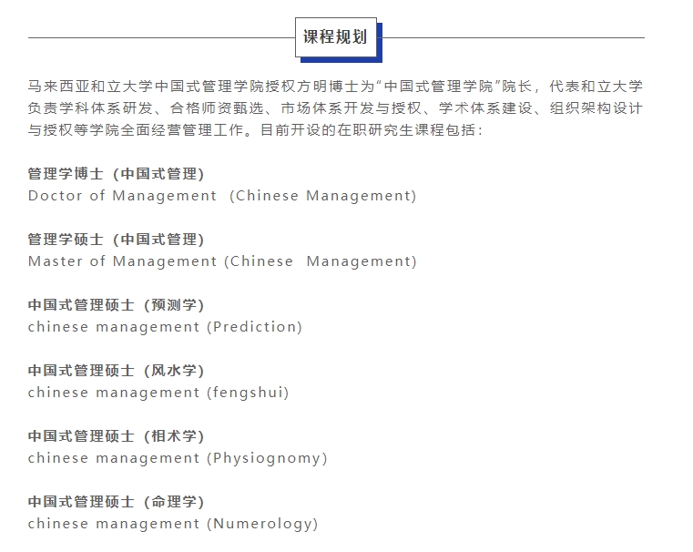 南海教育集团创新引领,致力于“模式的开创者、标准的制定者、行业的引领者”,经过团队多年的研究与实践,与马来西亚和立大学共建“中国式管理学院”,首次将“中国式管理”形成在职研究生(硕士、博士)学科教育体系,面向全球华人,开展“中国式管理”理论研究与管理实践。