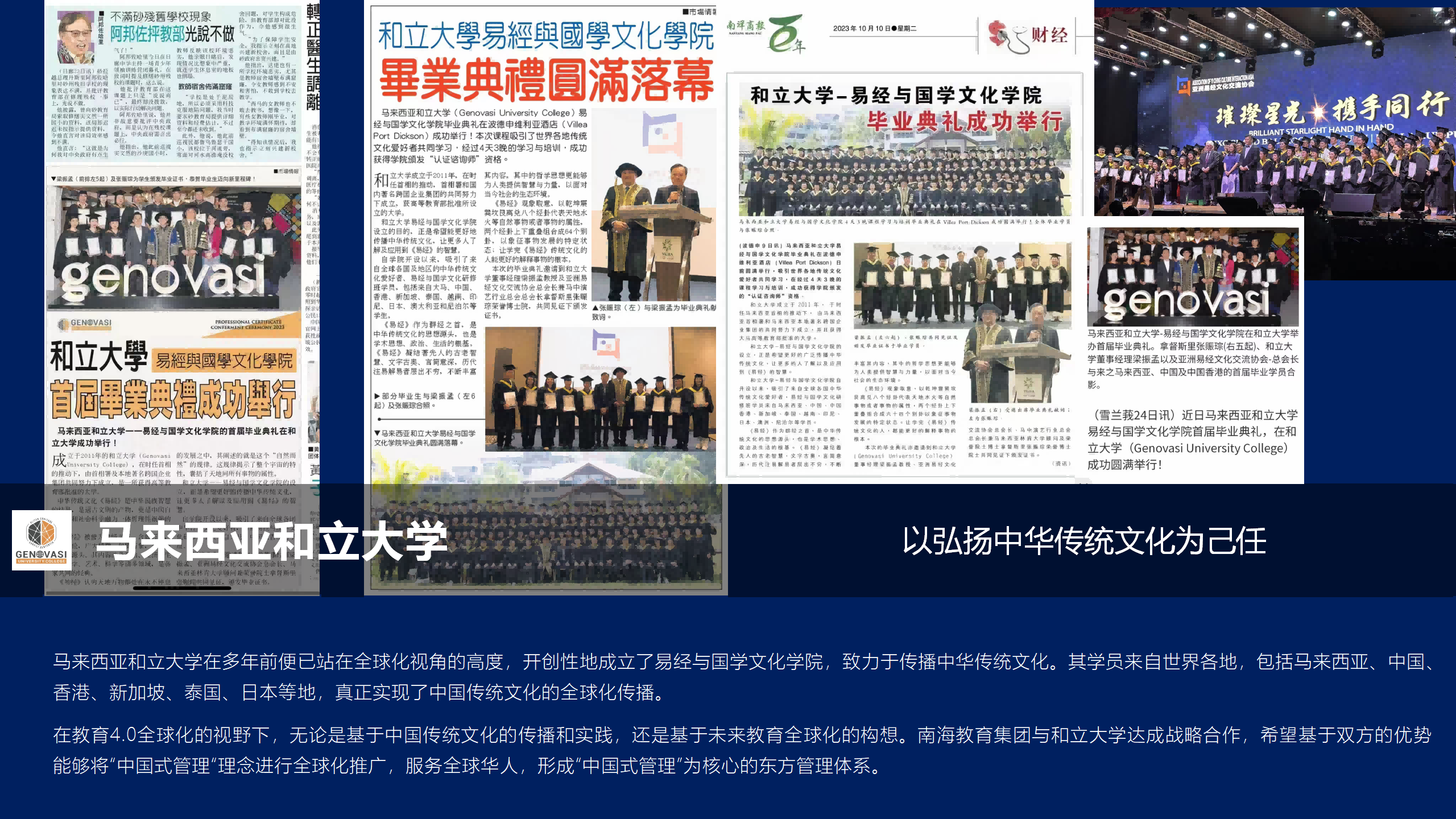 在全球化浪潮中,中华文化正以其独特的魅力吸引着世界的目光。马来西亚和立大学与深圳南海教育集团有限公司(简称:南海教育集团)强强联手,共同打造“马来西亚和立大学中国式管理学院”,将中国传统文化的精髓与现代管理科学相结合,为全球华人企业家提供全新的管理视角和实践案例。