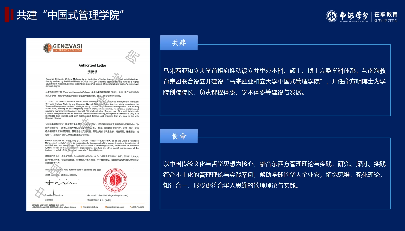 南海教育集团创新引领,致力于“模式的开创者、标准的制定者、行业的引领者”,经过团队多年的研究与实践,与马来西亚和立大学共建“中国式管理学院”,首次将“中国式管理”形成在职研究生(硕士、博士)学科教育体系,面向全球华人,开展“中国式管理”理论研究与管理实践。